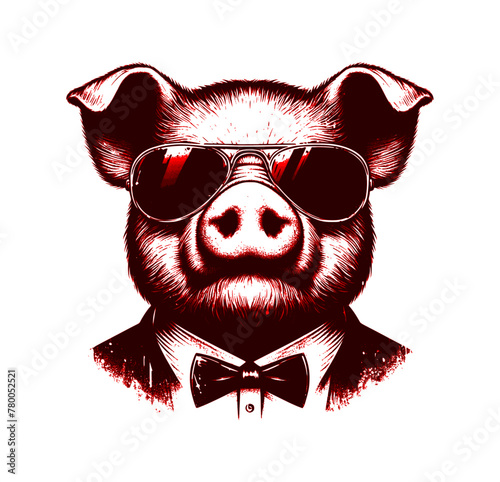 Cat in tuxedo blazer coat top hat and glasses sketch engraving vector illustration. T-shirt apparel print design. Scratch board imitation. Black and white hand drawn image.