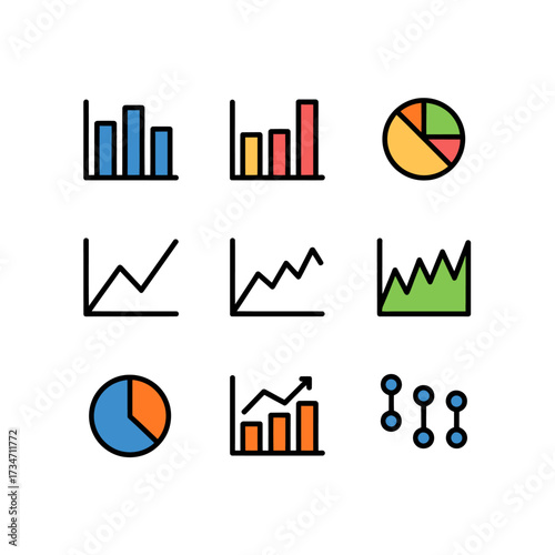 Collection of flat colorful diagram, bar and line graph, pie chart elements. Statistical data visualization concept. Simple infographic design template. Vector illustration for report, brochure.