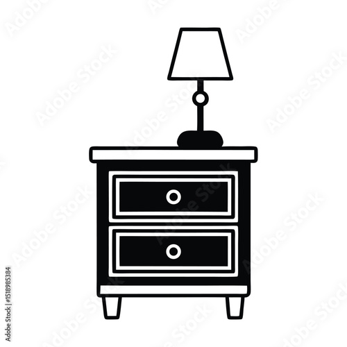 Black and white illustration of lamp on wooden nightstand with two drawers