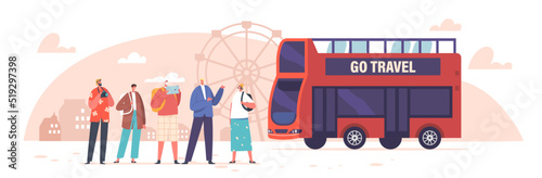 Tour excursion, tourist journey by bus, vector illustration. Flat people in tourism trip, holiday travel in city. Man woman traveler character at open transport, summer cartoon attraction service.