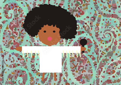 Mujer negra de perfil escuchando música con los ojos cerrados cascos morados y fondo rosa, retrato de mujer negra con pelo recogido liso vectorizado.