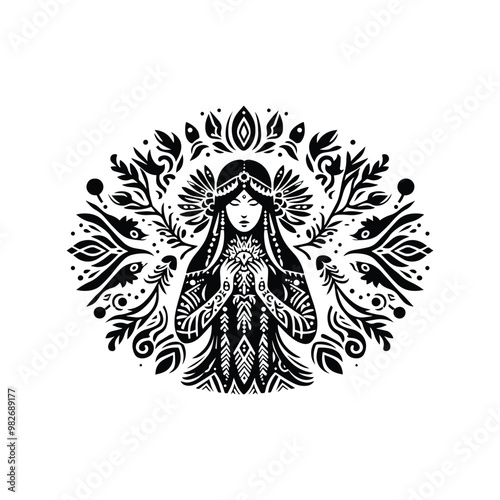 wizard female inside folk art decoration in black and white illustrations, cutout graphic