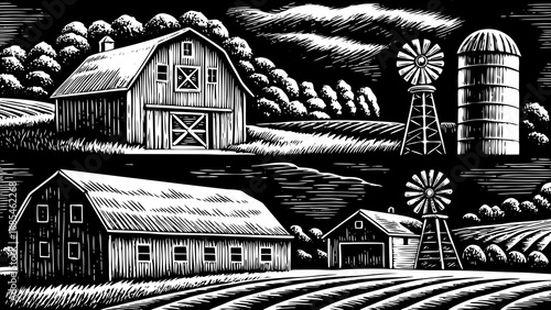 A hand-drawn agricultural engraving depicting summer and autumn maize cobs in a corn field, featuring a farm house and silos, rendered in black and white, capturing a sunrise rustic panorama in a