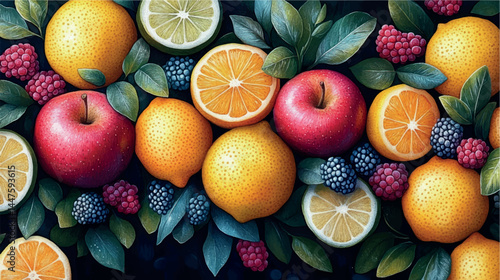Bright illustration of fruits, citruses and berries. Fruit cover, fruit print. Juicy fruits, berries and citrus fruits stylized illustration ornament.