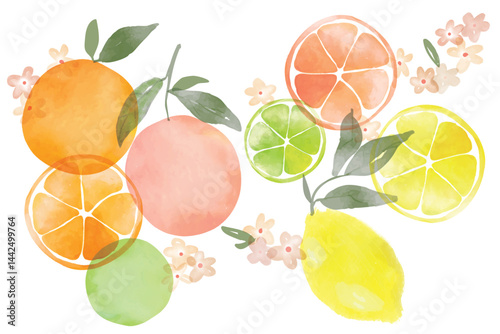 Set of colorful oranges, citrus, tangerine summer fruit. watercolor citrus pattern style. Blooming orange branch with leaves and flowers design.