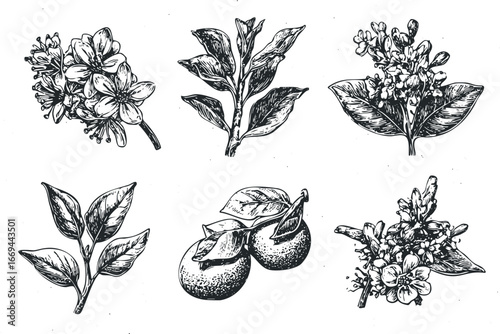 Tangerine flower and leaves isolated vector drawings set. Vintage illustration of citrus blooming flower. Engraved style sketch.