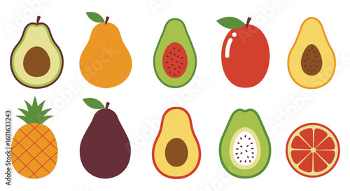 A set of icons with natural fruits and berries. Juicy tropical fruits. Avocado, kiwi, apple, pitahaya, papaya, watermelon, strawberry, mango, lemon, apricot, plum, fig, pear. cherry, banana. orange.