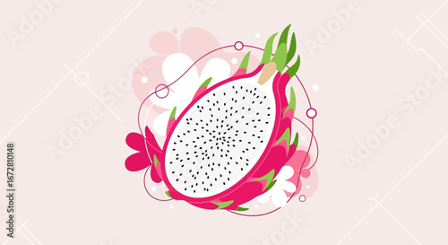 Vibrant dragon fruit illustration showcasing its exotic pink skin, green scales, and white flesh speckled with black seeds arranged on a white