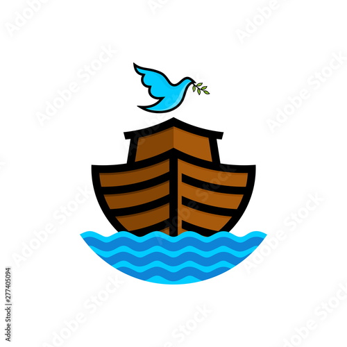 Logo of Noah's Ark. Dove with a branch of olive. Ship to rescue animals and people from the Flood. Biblical illustration.