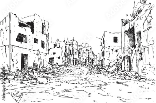 Black and white illustration of a destroyed city with collapsed buildings and debris scattered on the street