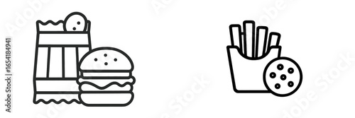 Minimalist Line Art Fast Food Icon Set – Burger, Fries, Soda Vector Illustration