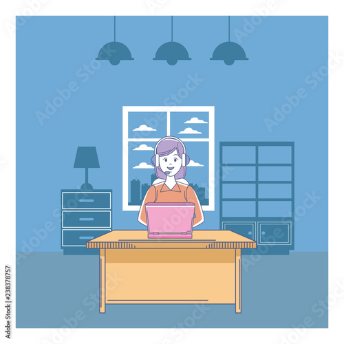 Call center operator works at computer. Woman in headset at customer help and support service. Online assistant, consultant in head set. Flat graphic vector illustration isolated on white background