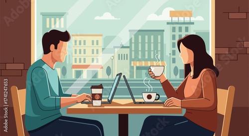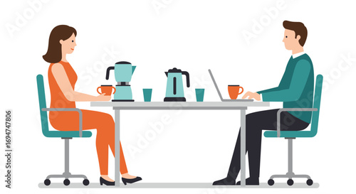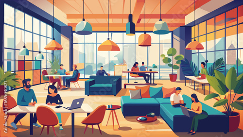 Flat vector illustration of people using laptops in shared co-working office. Solid tones, modern geometric furniture, clean perspective, no gradients, digital business lifestyle