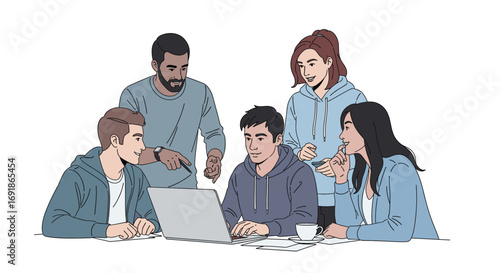 Diverse team collaborates productively in a modern, open office setting. Ideal for themes of business, teamwork, digital work, and a dynamic workplace environment.