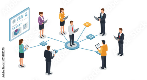 Isometric office conversations: teams collaborating and communicating in modern workspaces
