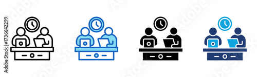 Office Teamwork Icons. Outline style icons of Office Teamwork: coworking at table, office group presentation, file sharing icon,