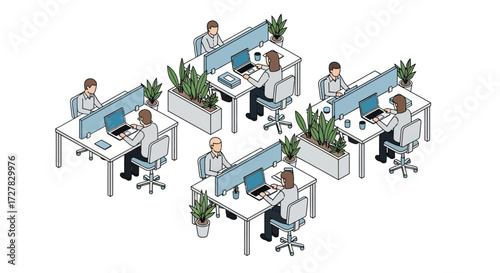 Isometric line art illustration of business people at coworking space. Minimalist vector design showing teamwork, office communication, and collaboration on white background