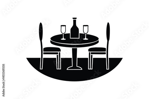 Romantic Dinner Table with Heart Line Art  - Black and white line drawing of a romantic dinner table set for two, symbolizing love, dating, special occasions, and fine dining.