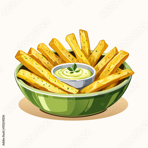 Delicious fried snacks with dipping sauce, French fries bowl, egg topped croquettes, cookie snacks, glass cups, food illustration artwork