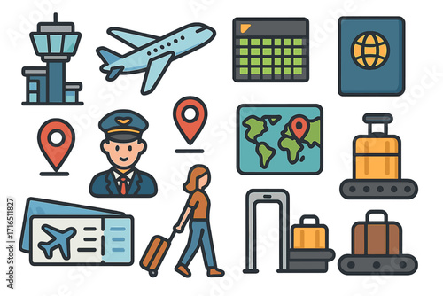 Travel icons: airplane, passport, luggage, security, taxi, waiting area