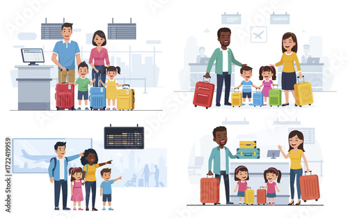Set Parents and Kids Characters in Stressful Travel Situation. Family with Children Late for Boarding Plane Run with Bag