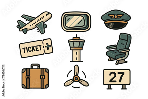 Aviation adventure icons set – outline, linear, flight and travel designs