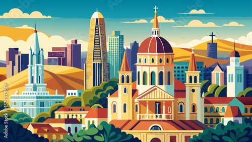 A vibrant illustration depicts a famous bridge in San Francisco against a scenic backdrop of hills and clouds, San francisco bridge Customizable Disproportionate Illustration