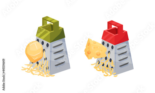 Block of cheese being grated by a metal cheese grater, with cheese shavings falling beneath