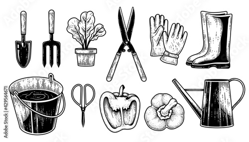 Sketch vector set of gardening tools. Trowel, Fork, Plant pot, Hedge shears, Gloves, Boots, Bucket, Scissor, Bell pepper, and Watering can Hand drawn illustration