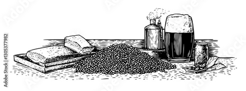 Illustrative engraving of traditional brewing supplies showcasing grains, barrels, and a stone in a rustic setting