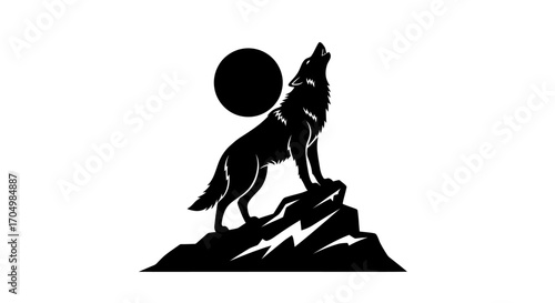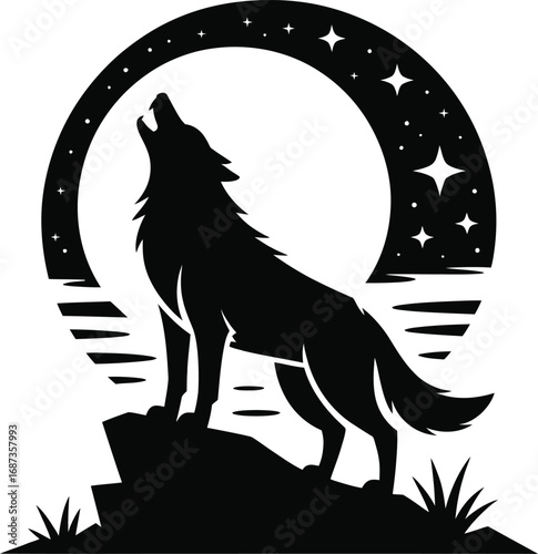 Silhouette of a howling wolf against a circular moon backdrop.
