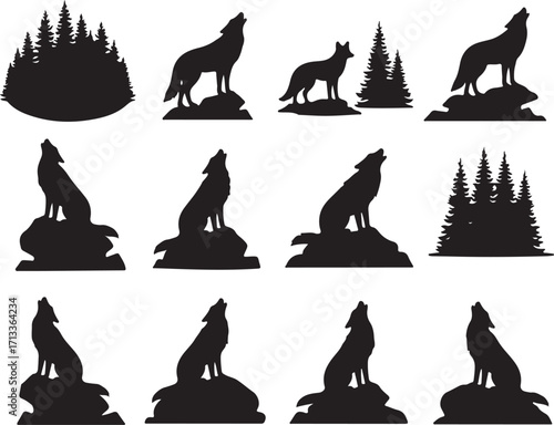 A wolf howling in a dense forest with tall trees vector animal silhouette