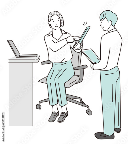 相談しながら仕事するスーツの男女