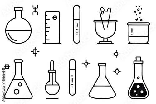 Chemistry icon set. Containing Laboratory test flask, reaction tube, chemistry lab, experiment, Chemical formula, Microscope, and more. Outline Icon Collection. Vector illustration. Editable stroke