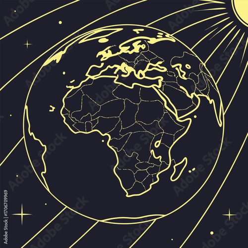 Dark Theme Earth Different Sides set. World, America, Europe, Africa and Asia with Australia vector globe icons. Thin Editable line illustration on dark background.