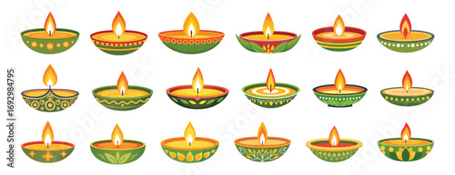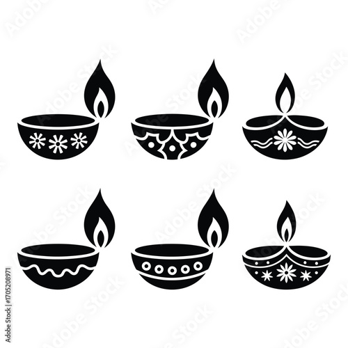 Diwali Diya oil lamp vector illustration set. Hand drawn traditional Indian lamps with ornament for Hindu festival of lights.