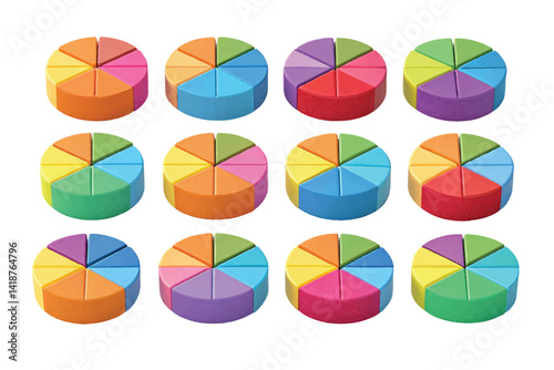 Pie chart set. Different color circles. donut and pie chart infographic elements. Colorful diagram graphs. Circle section graph. Pie chart divided 1, 2, 3, 4, 5, 6, 7, 8, 9, 10, 11, 12 equal parts
