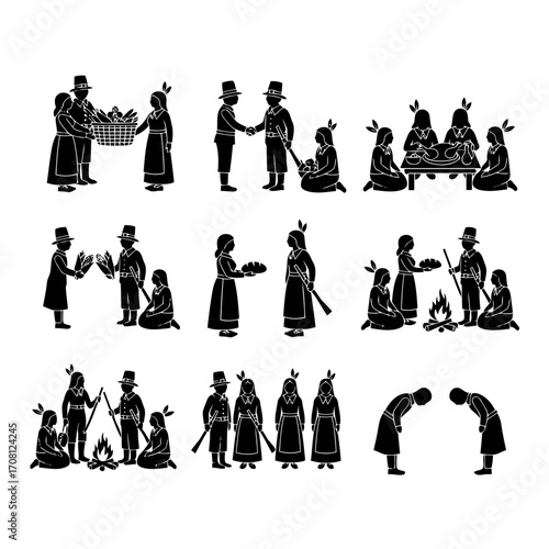 Thanksgiving silhouette set featuring pumpkins pilgrims native american headdress and turkey iconography