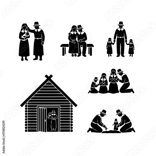 Thanksgiving silhouette icons pilgrim hats pumpkins turkey native american headdress festive symbols