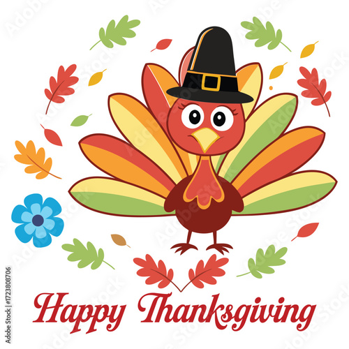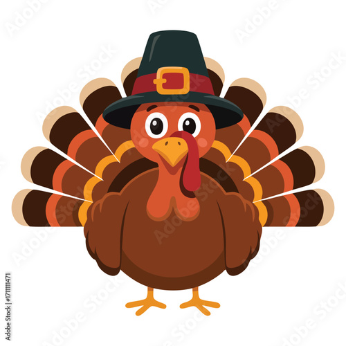 A cute cartoon turkey wearing a pilgrim hat, perfect for Thanksgiving greeting cards, flat style vector.
