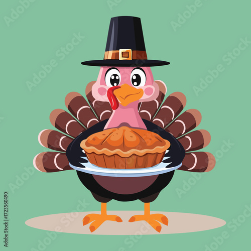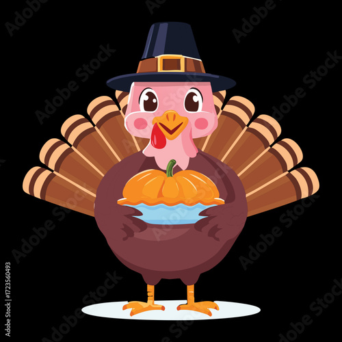 Cute cartoon turkey chef dressed in a classic pilgrim hat holding a hot homemade pumpkin pie for the holiday feast