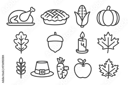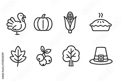 Thanksgiving line icon set. Autumn holiday symbols. Vector collection with turkey, pumpkin pie, corn, pilgrim hat, maple leaf, candle, and apple. Fall feast outline elements.