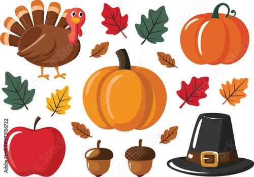 Autumn harvest icons, roast turkey pumpkin pie cornucopia, maple leaf pilgrim hat acorn, seasonal thanksgiving clipart set, vector graphics, festive dinner elements