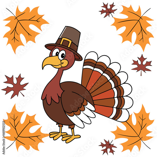 Cute cartoon turkey wearing pilgrim hat with autumn leaves and pumpkin