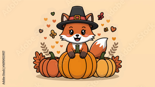 Adorable cartoon fox wearing a pilgrim hat sits on pumpkins surrounded by autumn leaves and butterflies a charming thanksgiving silhouette