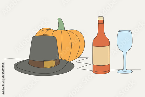 Colored Pumpkin pilgrim hat and a bottle of beer. Thanksgiving concept one-line drawing
