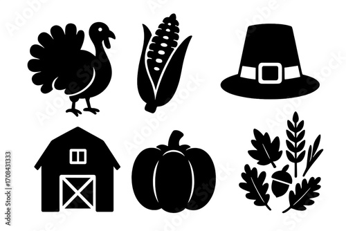 Thanksgiving silhouette icons collection with turkey, corn, pilgrim hat, barn, pumpkin, and autumn harvest leaves, acorn, wheat, fall symbols, vector cartoon illustration set