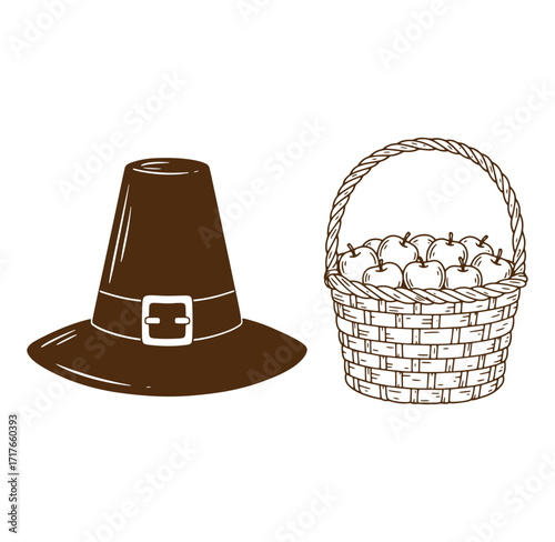 Brown pilgrim hat and basket of apples thanksgiving holiday illustration isolated on white