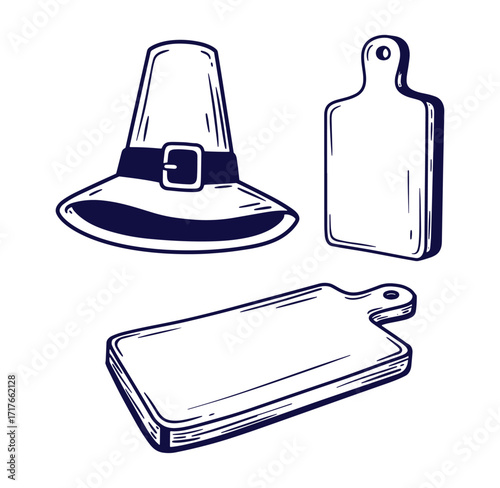 Hand drawn illustration of a pilgrim hat and kitchen cutting boards on a white background.