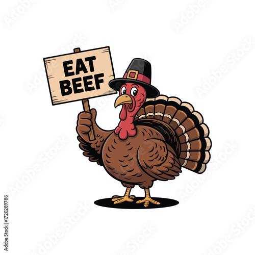 Cartoon turkey wearing pilgrim hat holds eat beef sign